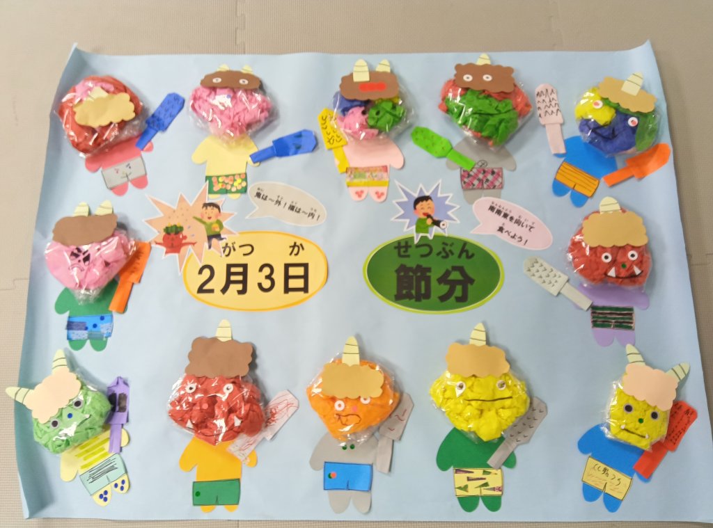 今年最初の制作は縁起の良いだるま作りを行いました。だるまには転んでも起き上がる、願い事が叶うという意味が込められています。子供達に今年の目標を考えてもらい書いてもらいました。素敵なダルマが完成!みんなの目標が叶いますように😊節分の制作は鬼の壁面飾りを作りました。スタッフの説明を聞いてとても集中して取り組むことが出来ました。可愛い鬼やかっこいい鬼など個性豊かな作品になりました。